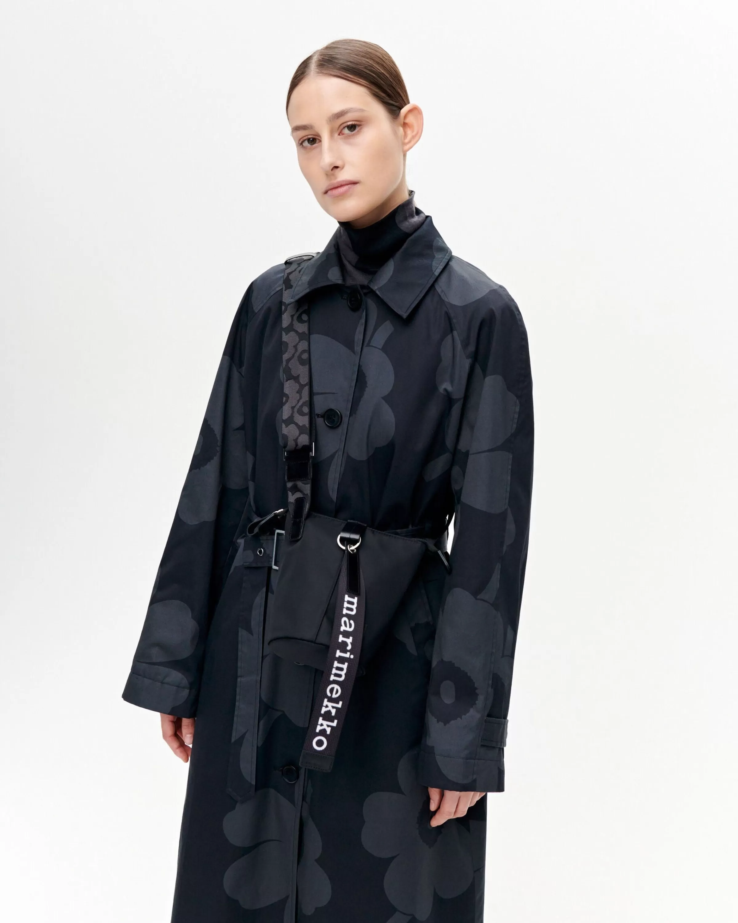 Pienessä Laukussa On Vetoketjukiinnitys Sekä Säädettävä Olkahihna, Jossa On Jacquard-Kudottu Unikko-Kuosi. Etupuolelle On Kiinnitetty Marimekko-Avaimenperä Ja Takapuolella On Yksi Avoin Tasku. Laukussa On Nahkaisia Yksityiskohtia.Koko & Istuvuus