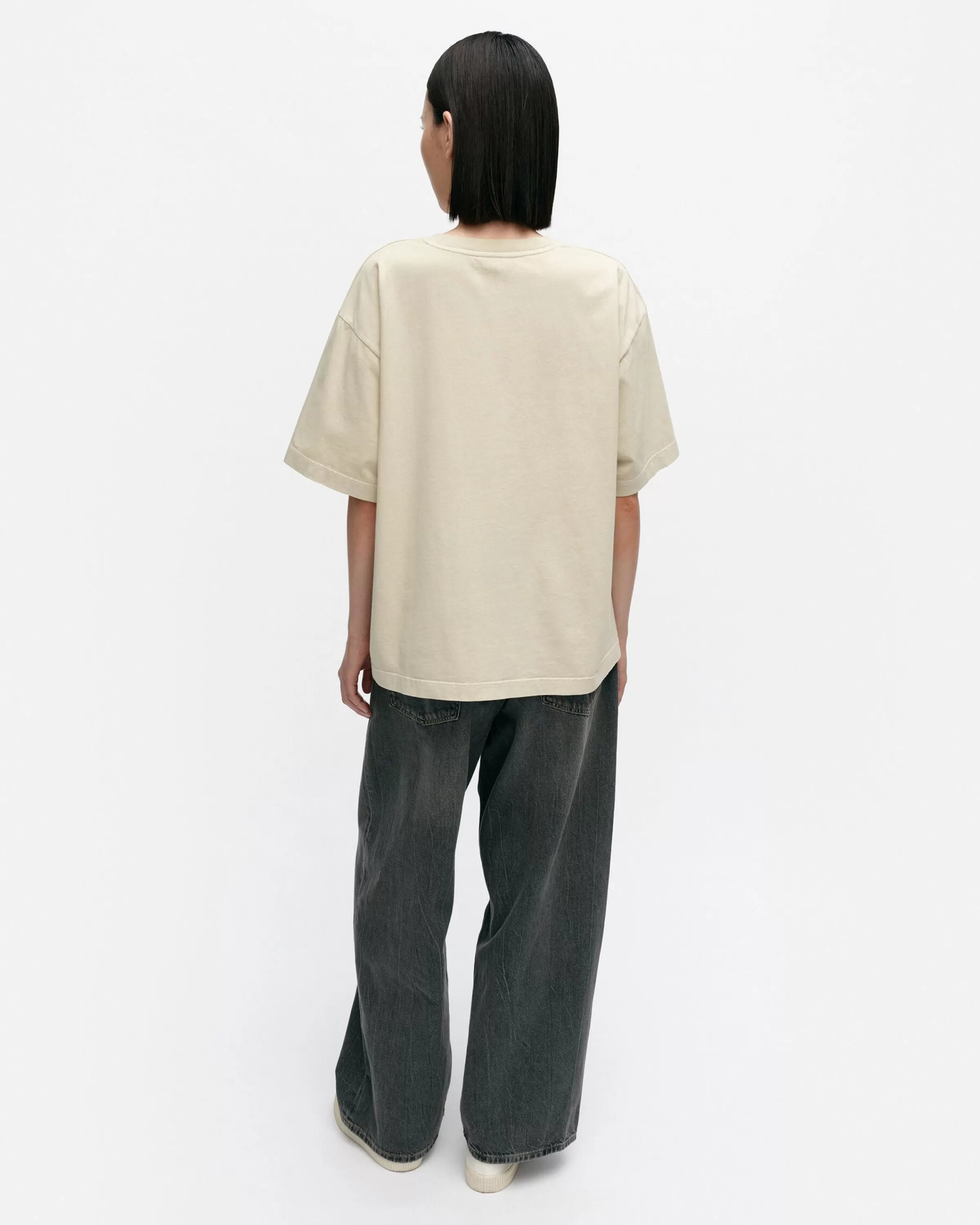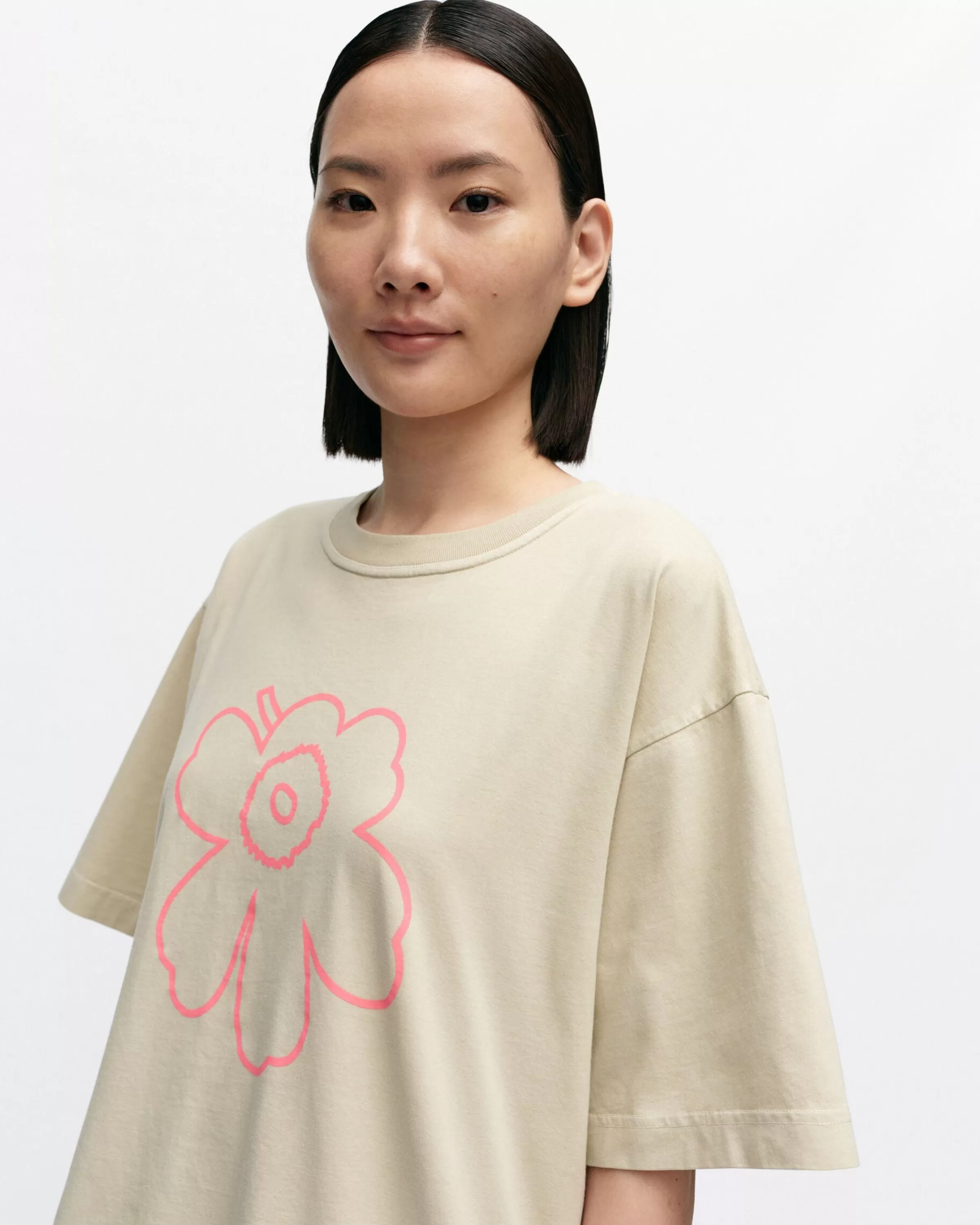 Veig-T-Paita On Valmistettu Mineraalivärjätystä Luomupuuvillatrikoosta Ja Siinä On Väljä Istuvuus. T-Paidassa On Neonvärillä Painettu Piirto Unikko -Kuosin Kukka Etupuolella Ja Leveä Resori Pyöreässä Pääntiessä.